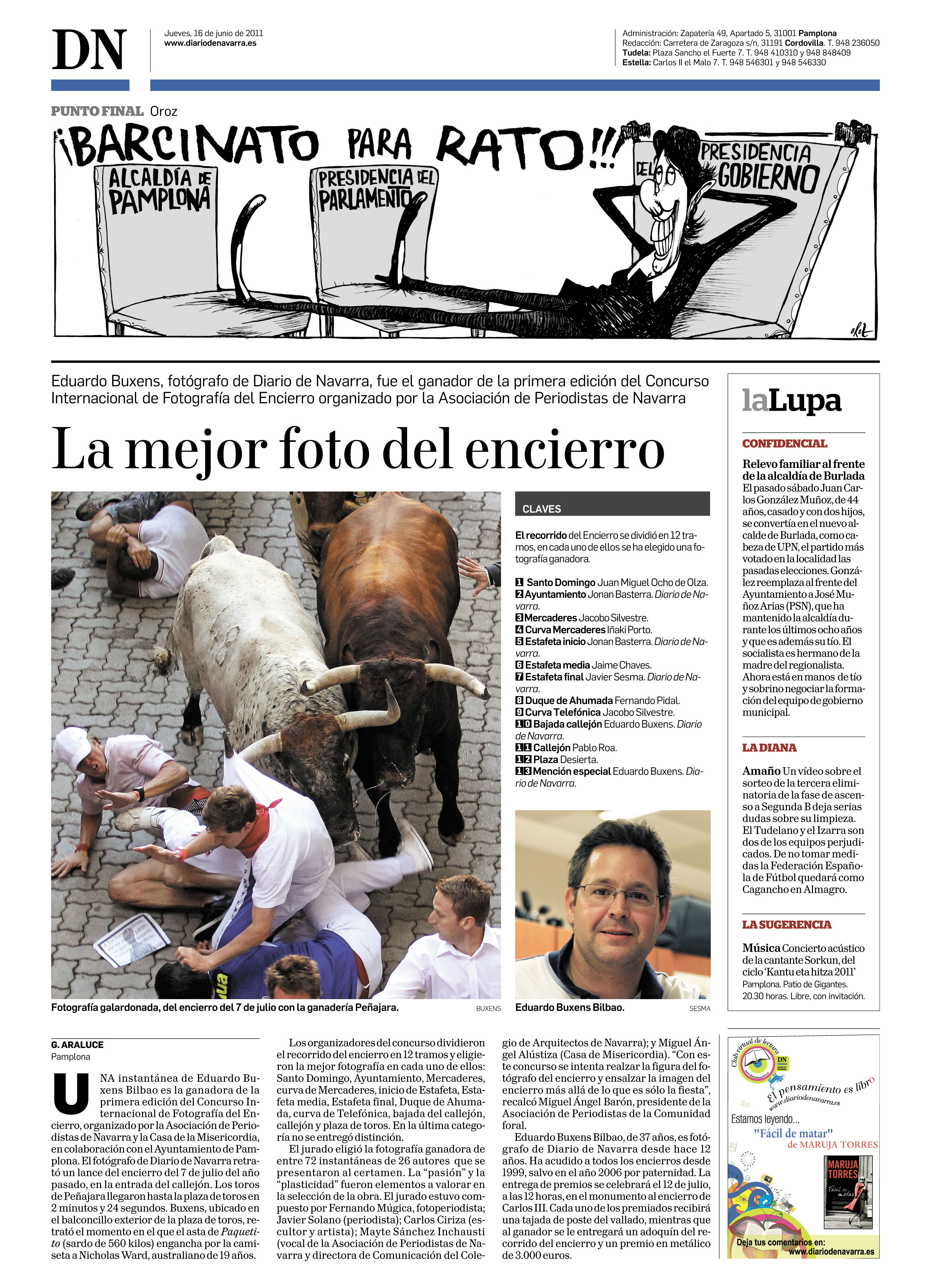 Ganador del Concurso Internacional a la mejor fotografía del encierro del 2012 organizado por la Asociación Navarra de la Prensa.