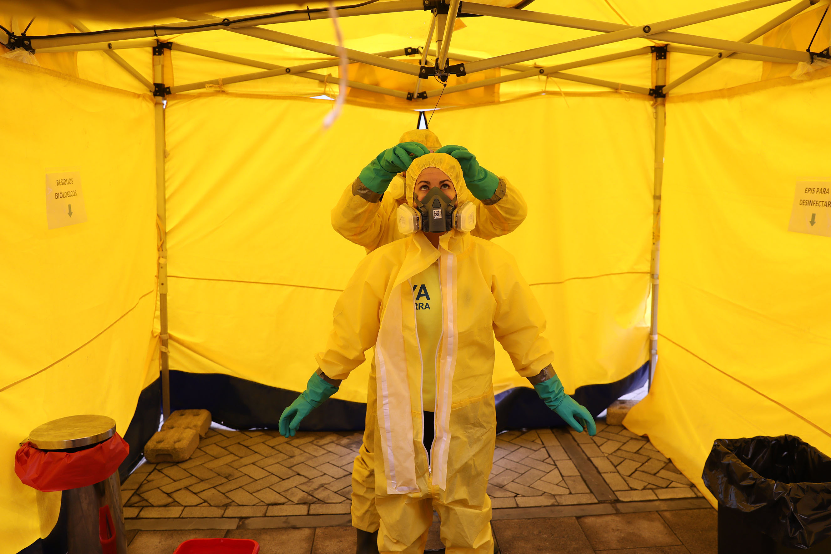 P: LEIRE RUBIO OLCOZ , VOLUNTARIA DYA SE RETIRA EL EQUIPO DE PROTECCIÓN TRAS TRES HORAS DE TRABAJO DE DESINFECCIÓN DE AMBULANCIAS Y EQUIPOS SANITARIOS